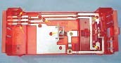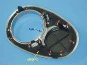 圖5 所示為揚(yáng)聲器組合件的背面。圖中的黑色部分為內(nèi)部支撐/卡扣結(jié)構(gòu)件,材質(zhì)為ABS+PC 塑料合金,揚(yáng)聲器裝飾面板格柵為金屬網(wǎng)格,邊框飾件采用了表面電鍍金屬銀灰色的ABS 塑料。該組合件使得可電鍍ABS塑料的良好視覺(jué)效果與ABS+PC 塑料合金的高強(qiáng)度、高抗沖擊性得到了最佳組合。圖中紅色箭頭所指處為鉚接點(diǎn),ABS 飾蓋板預(yù)模塑的鉚柱穿過(guò)ABS+PC 合金結(jié)構(gòu)件上的對(duì)應(yīng)孔中,采用沉頭平鉚接形式連接,使其具有更好的性能,可降低重量和加工成本。